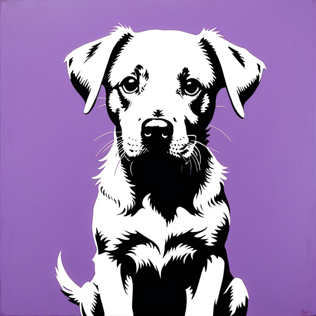 Portrait of a dog, lavender color tone, contemporary, Banksy