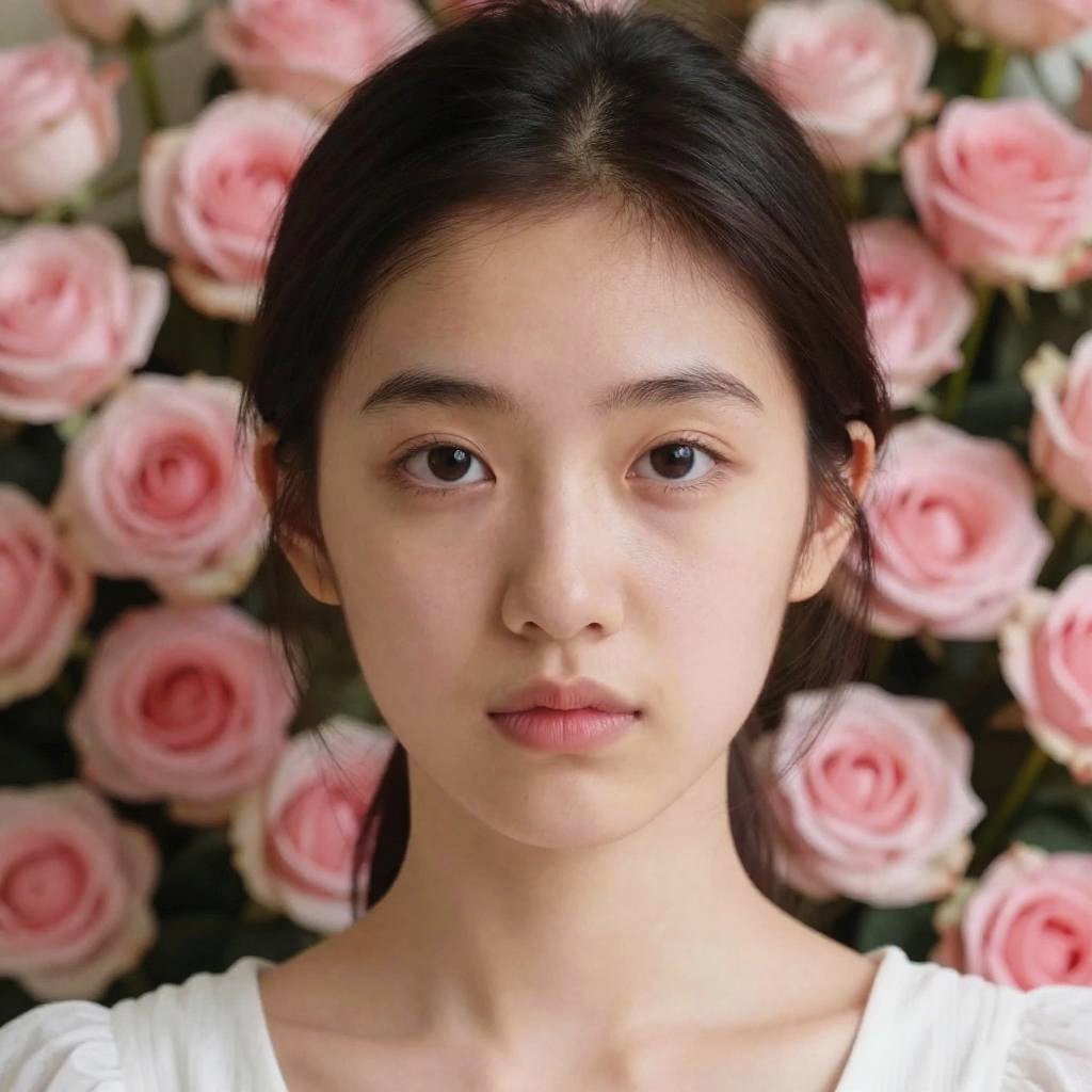 Photograph of a young Asian woman with fair skin and dark brown hair pulled back, wearing a white top. She has large, dark brown eyes, a straight nose, and slightly parted lips. The background is filled with a dense arrangement of pink roses, creating a soft, floral backdrop. The image focuses on her face, which is centered, and the roses are slightly out of focus, emphasizing her as the main subject. The lighting is natural, highlighting her smooth skin and the delicate petals of the roses behind her.