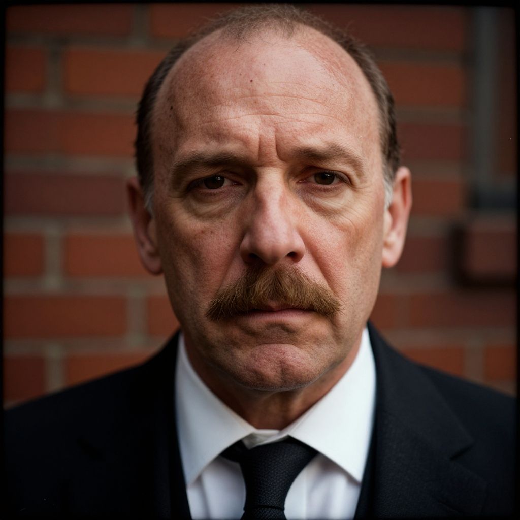 Sharp macro quality, Harvey Keitel, wet plate photography, close-up of a man with a mustache in a black suit and tie and white shirt, with a gan, a background of red bricks in an American city, rough skin, sad eyes, sparkles, age 55, dust carbon in the air, unreal engine, UE5, cinematic, highly detailed, Sony A7iii, 85mm prime, f/1.8, octane + hyperrealistic rendering, photography