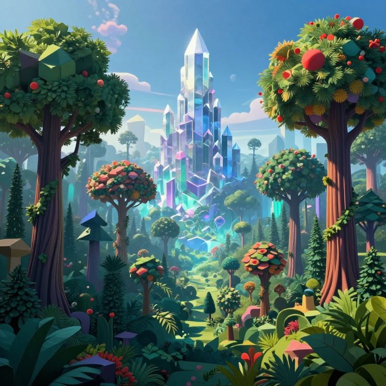 Vibrant CGI landscape with colorful, abstract trees, musical notes floating in the sky, and a small figure walking through a lush forest under a pink