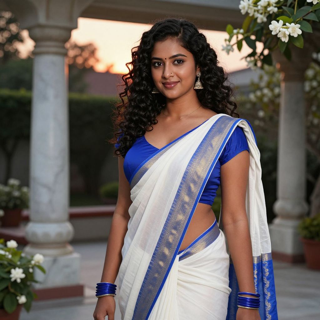 A young Indian woman with smooth olive skin, curly black hair, and a gentle smile dressed in an elegant white and blue silk saree as part of a cultural costume, posing in a traditional courtyard garden with marble pillars and blooming jasmine flowers at sunset.. The woman has big breasts and cute face