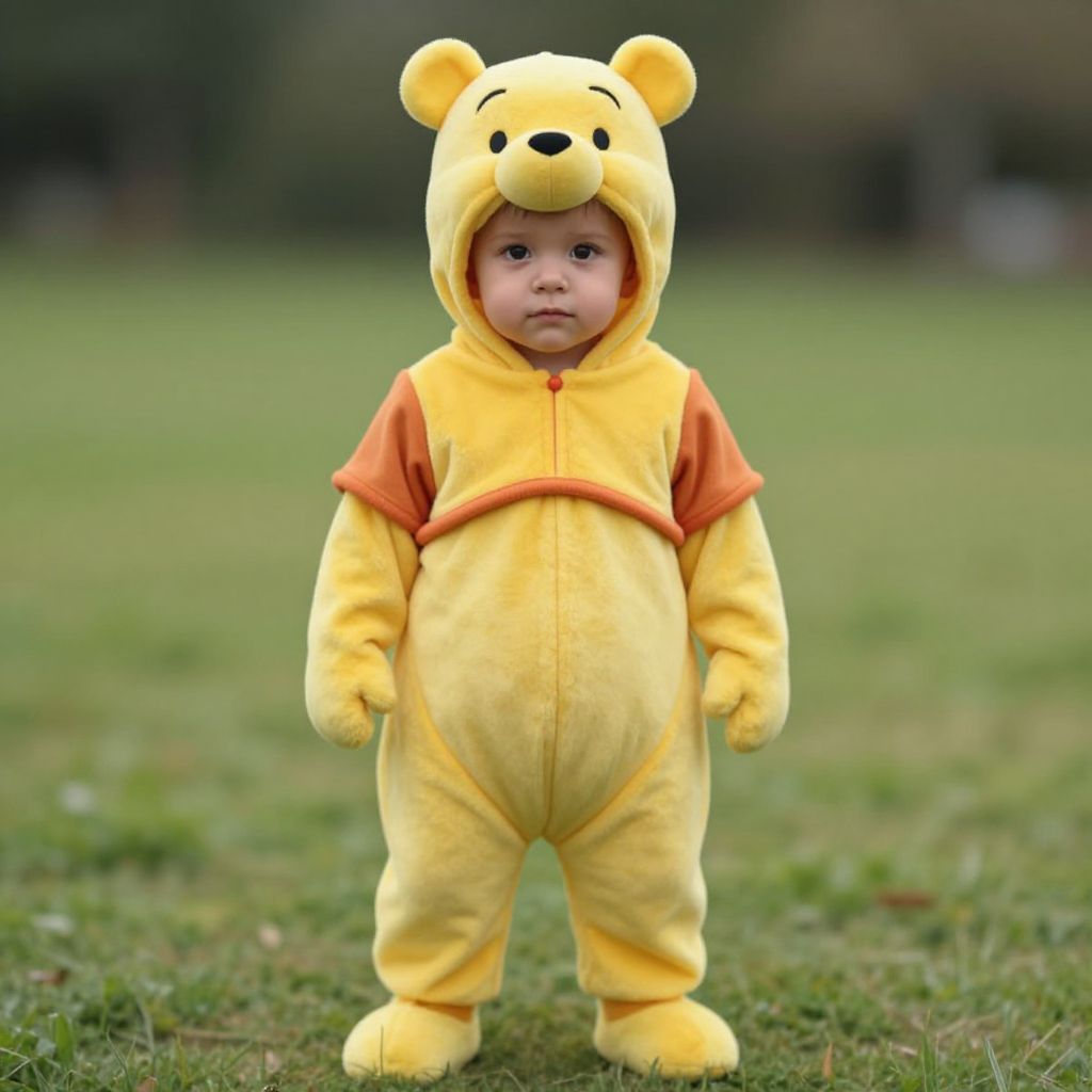 Photograph of a baby standing outdoors on a green grassy field, wearing a yellow Winnie the Pooh onesie with bear ears, a round nose, and orange sleeves. The baby has light skin, blue eyes, and a neutral expression. The background is blurred with dark green trees. The onesie has a soft, plush texture, and the baby's hands are relaxed by their sides. The overall lighting is natural, highlighting the baby and the bright yellow outfit.
