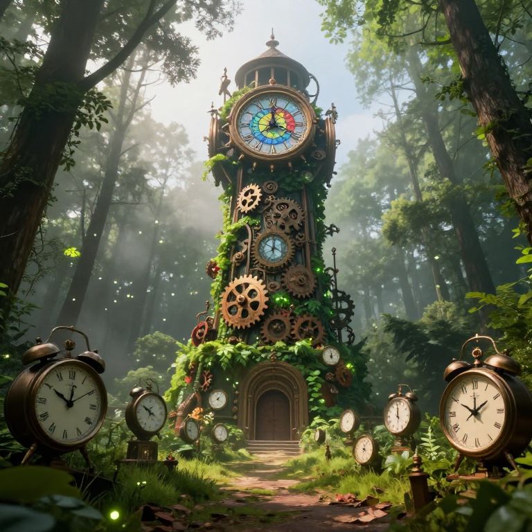 An imaginative fusion between surrealism and steampunk, envision a towering tower rising from an enigmatic forest shrouded in mist. The tower's facade is adorned with gears and cogs interwoven with vibrant ivy and bioluminescent fireflies, while its clock face mesmerizes with an ever-changing mosaic design that adapts to the viewer's movement. From a first-person viewpoint, stand in awe beneath this union of nature and machinery within a sunlit glade filled with clocks of various sizes - some ticking, others whispering their silent time. This scene evokes a sense of wonder, harmonizing the serenity of the forest with the intricate beauty of its mechanical guardian.