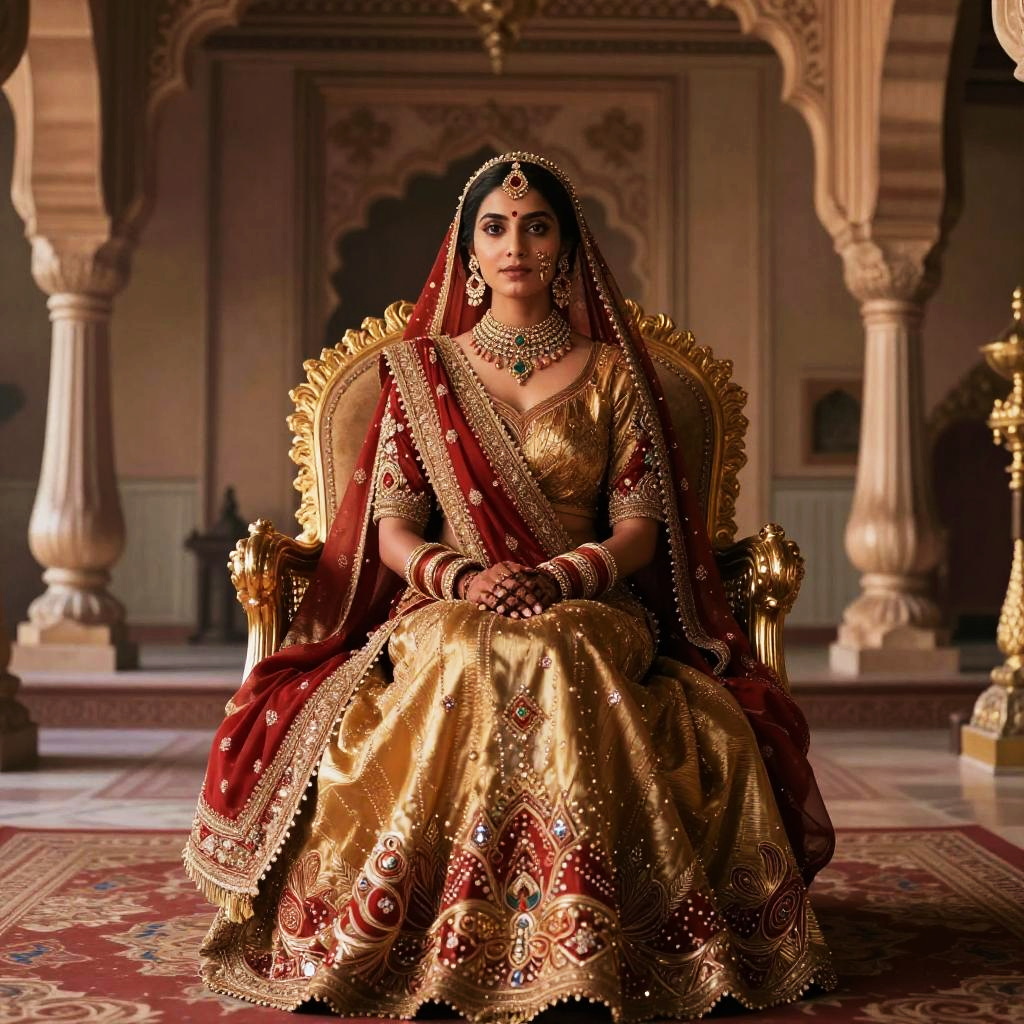 Photograph of three Indian women in vibrant, ornate traditional attire dancing in a dimly lit, lantern-adorned, arched room.