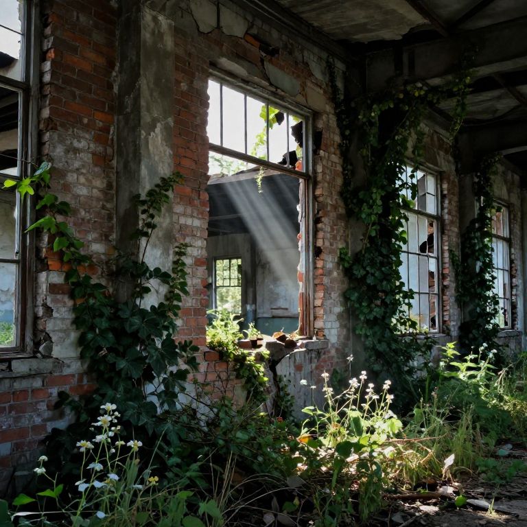 Photograph of an abandoned, sunlit brick building with broken windows, overgrown with green vines and wildflowers, sunlight streaming through.