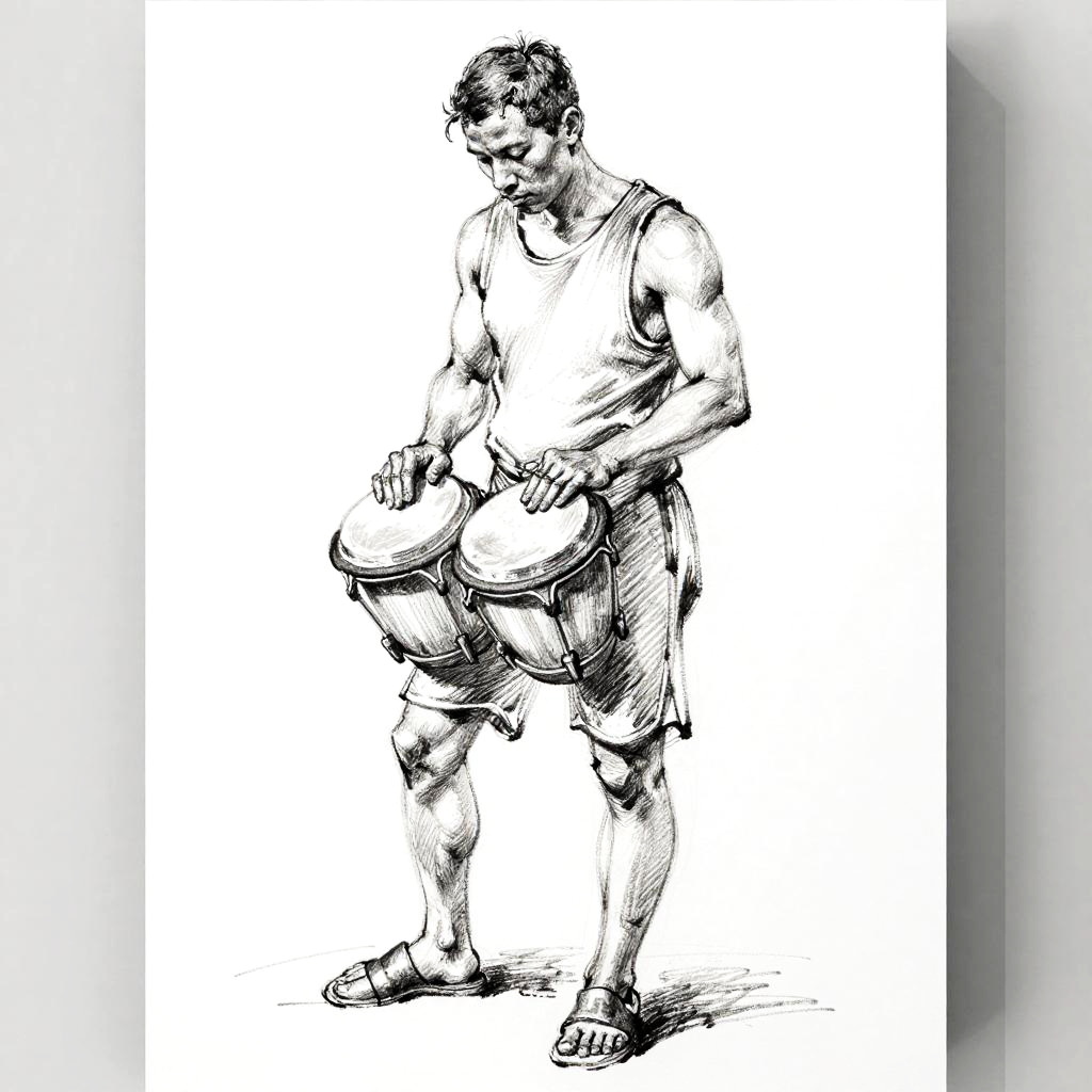 This is a silverpoint sketch study of a muscular man in a sleeveless shirt and shorts holding bongo drums. One leg slightly forward, head tilted down, eyes on the strings. Quick gestural lines, confident hatching, smudged shading, casual and spontaneous. High contrast black and white on mostly white background with soft gray side borders and subtle paper texture. Clean composition, minimal props, slight figure tilt. Studio light from above, gentle falloff, elegant and restrained mood.