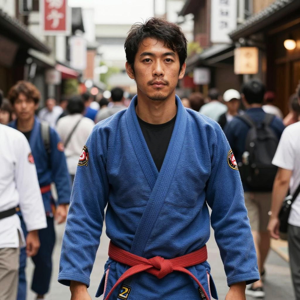 Jiro Mha, man in a blue shirt and red belt standing in a crowded street