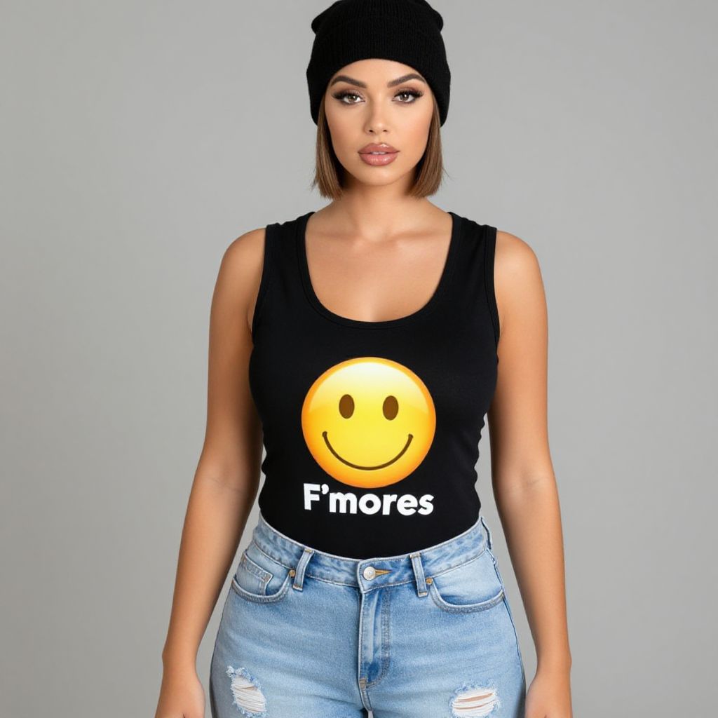 "Woman, casual, black sleeveless tank top with a graphic print of a yellow emoji and white text, scoop neckline, light-wash denim jeans, form-fitting, ripped at the knees, black knit beanie.. Sexy. Pretty face and beаutiful eyes. Big breasts."
