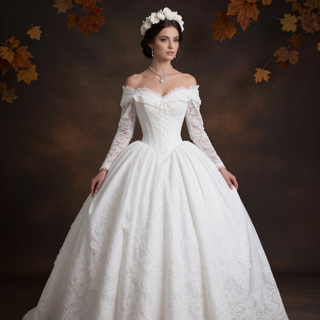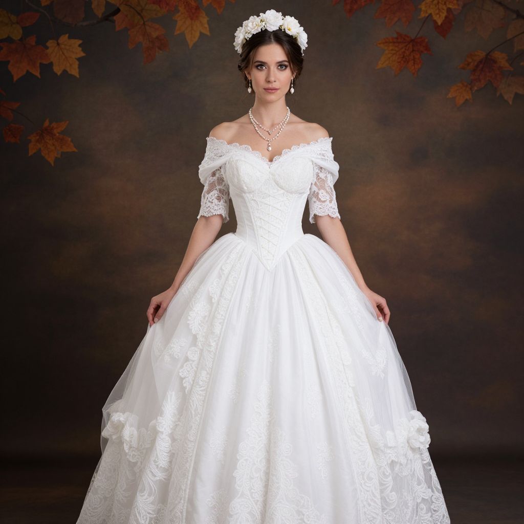 Elegant woman wearing a pristine white Victorian ball gown with off-the-shoulder sleeves, intricate lace detailing, and a fitted corset bodice, complemented by a floral crown and delicate jewelry, stands gracefully against a moody backdrop adorned with autumnal leaves.