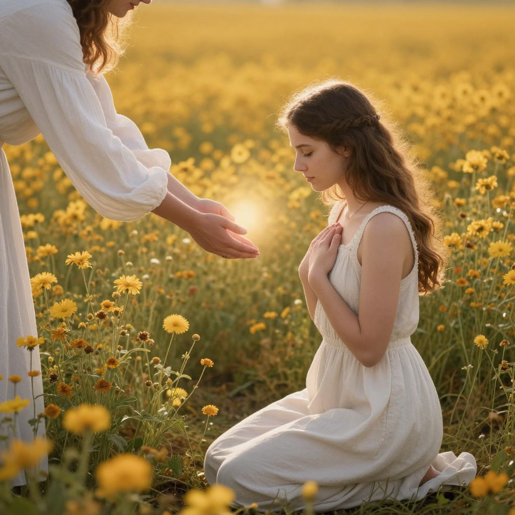 In a radiant field of golden flowers, a tender exchange of faith and guidance unfolds, as a young woman kneels in prayerful reverence, her heart illuminated by the presence of a compassionate figure whose outstretched hands offer solace and direction, embodying the eternal promise of divine light and hope.
