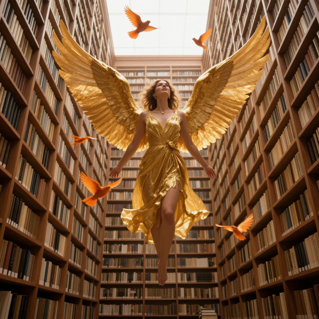 A woman with radiant golden wings soars gracefully between towering bookshelves that stretch endlessly into the sky, surrounded by fluttering orange birds that seem to emerge from the pages themselves.