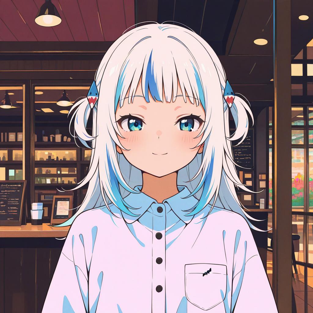 (flat_color, pastel_style, anime, black_outlines:1.2), 1girl, gawr gura, detailed eyes, coffee shop, portrait, buttons, white shirt, collared shirt, black pants, volumetric lighting, colorful, cute