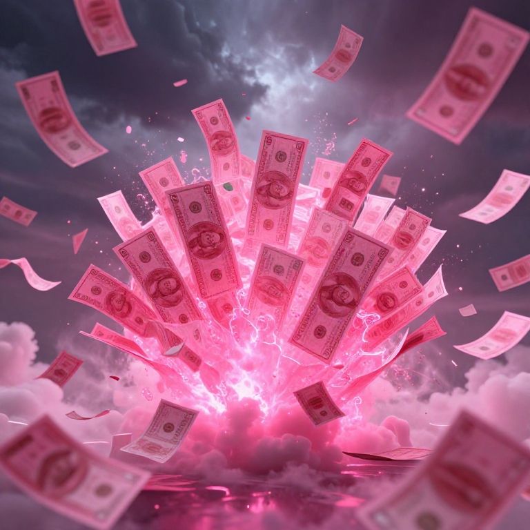 Digital illustration of a dramatic scene featuring a bright, explosive burst of pink and red cash bills shooting upward from a central point. The background is a dark, cloudy sky with a celestial glow, adding a sense of wonder and intensity. The bills have visible denominations and intricate designs, with some partially obscured by the dynamic motion. The explosion creates a radiant, glowing effect, illuminating the surrounding clouds and bills. The image captures a sense of abundance and energy, with the cash bills appearing to be in mid-air, swirling and cascading outward.