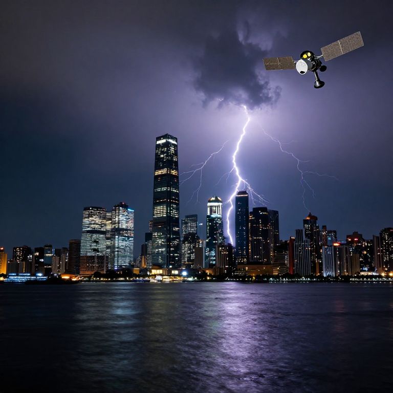 A futuristic city skyline at night, illuminated by lightning strikes and reflections in the water, with a satellite in the sky.