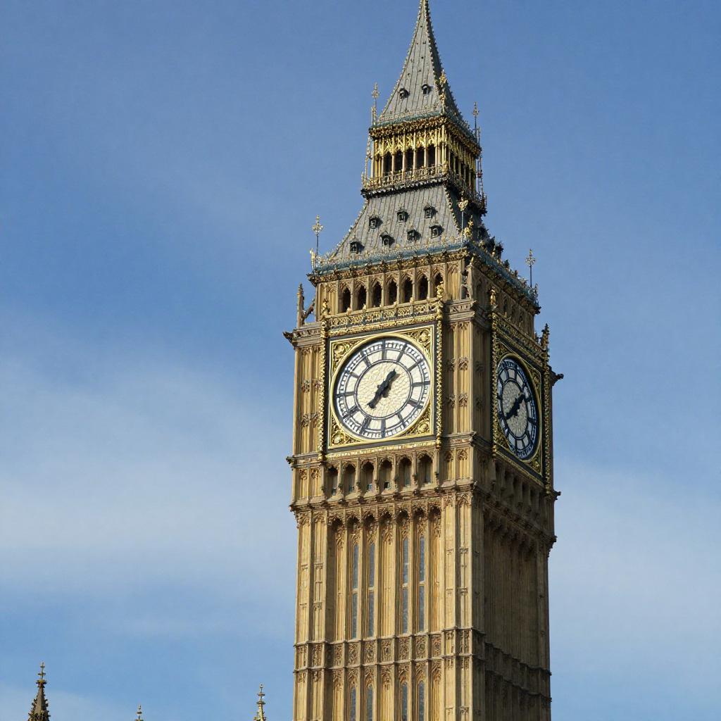 Close-up photo of a classic bright red British telephone box with the iconic Big Ben clock tower in the background, under a clear blue sky. The image captures the traditional London landmark combination with strong sunlight highlighting the colors and details.