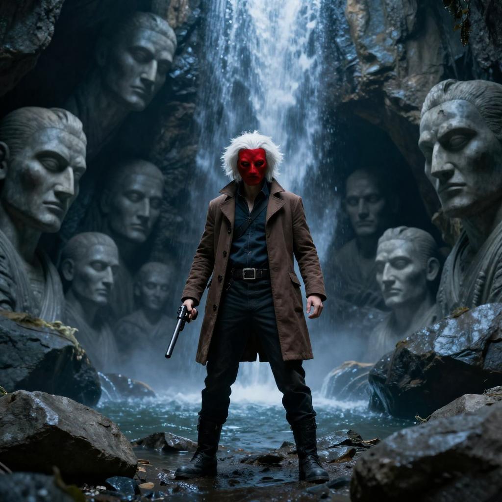 Man with wild white hair and red mask, wearing brown coat, holding gun, standing in rocky cave with glowing blue waterfall. Multiple large, gray faces on cave walls. Intense, focused expression. Blue and gray color palette. Cave walls in background.