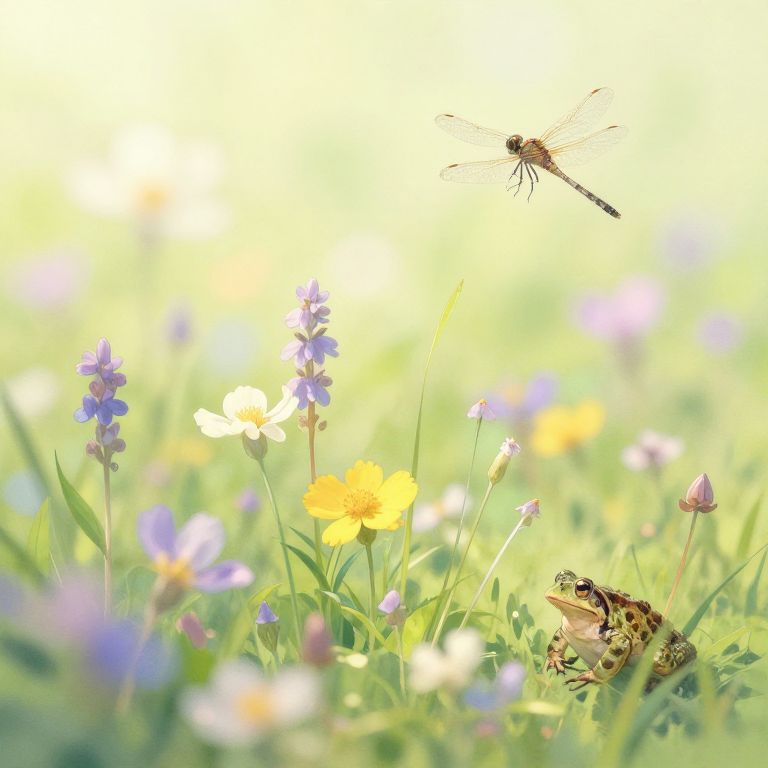 Close-Up Shot, wildflowers growing in a meadow, magicial beauty, ethereal, soft colors, acrylic, peaceful, dragonflies, a toad,