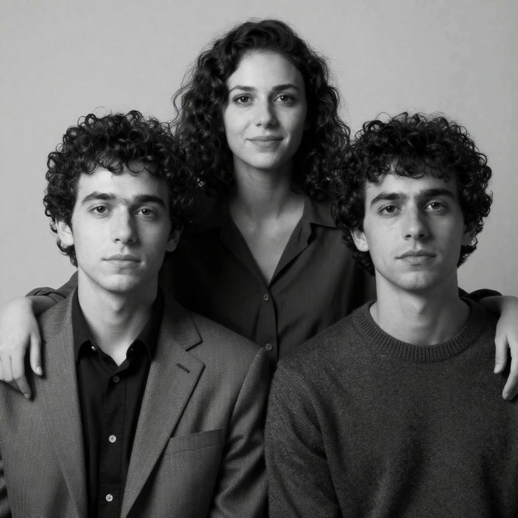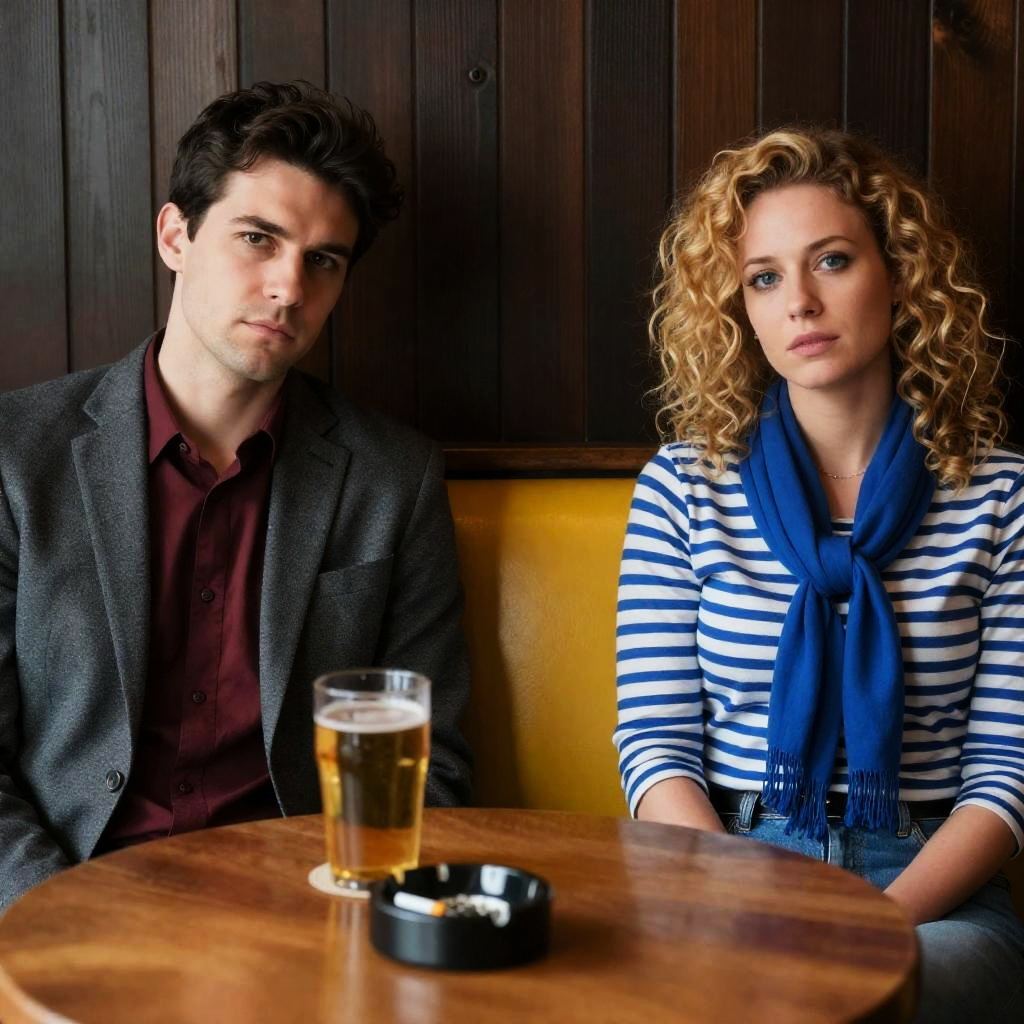 Three people on a bed, sitting close together. A man with curly hair, wearing a white shirt, holding a cigarette. A woman with dark hair, wearing a colorful patterned blanket, leaning against the man. Another man with short brown hair, wearing a white shirt, holding a cigarette. Blue bedspread, white headboard. All relaxed, looking slightly to the side.