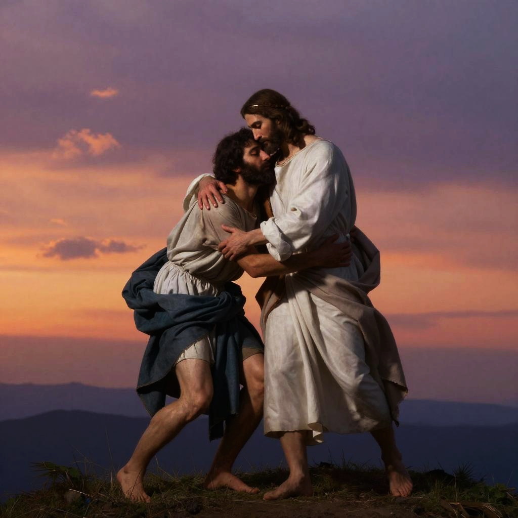 Jesus embracing man on a hilltop at sunset, dramatic sky with orange and purple hues, detailed, emotional connection, painted in a classical renaissance style
