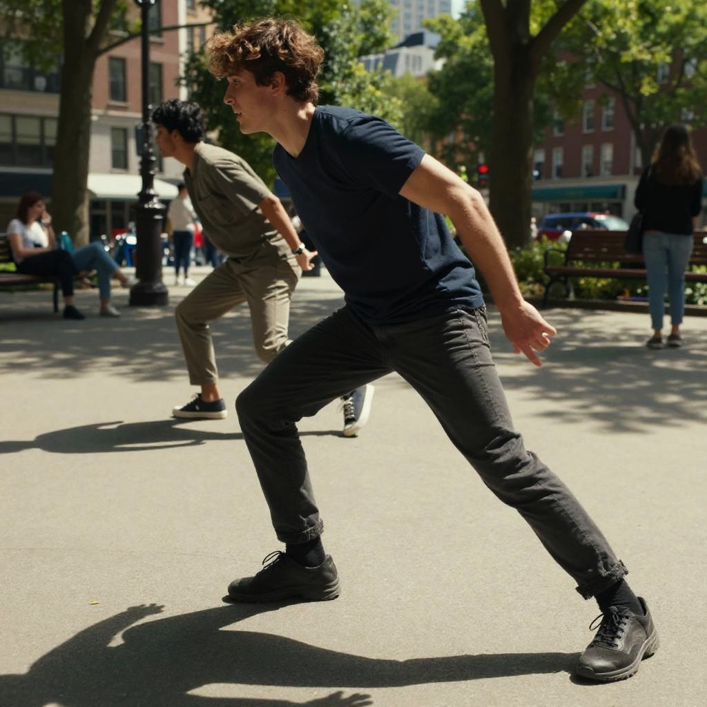 Photograph of a young man with curly brown hair, wearing a navy blue t-shirt and black jeans, striking a dynamic, crouched pose on a sunlit urban street. His right leg is bent forward, and his left leg is extended back, with arms slightly raised. He wears black sneakers. In the blurred background, another man in a beige shirt and pants stands with a similar stance. Trees, buildings, and pedestrians are visible, with sunlight casting shadows on the pavement. The scene conveys motion and energy, capturing a moment of street dance or movement.