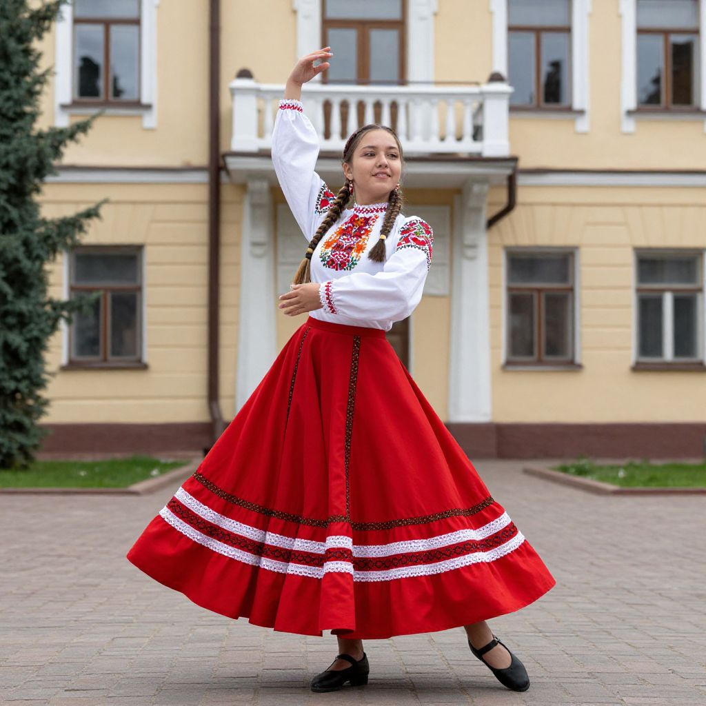 Maria clara folk dance costume, woman in traditional russian dress standing in front of a building
