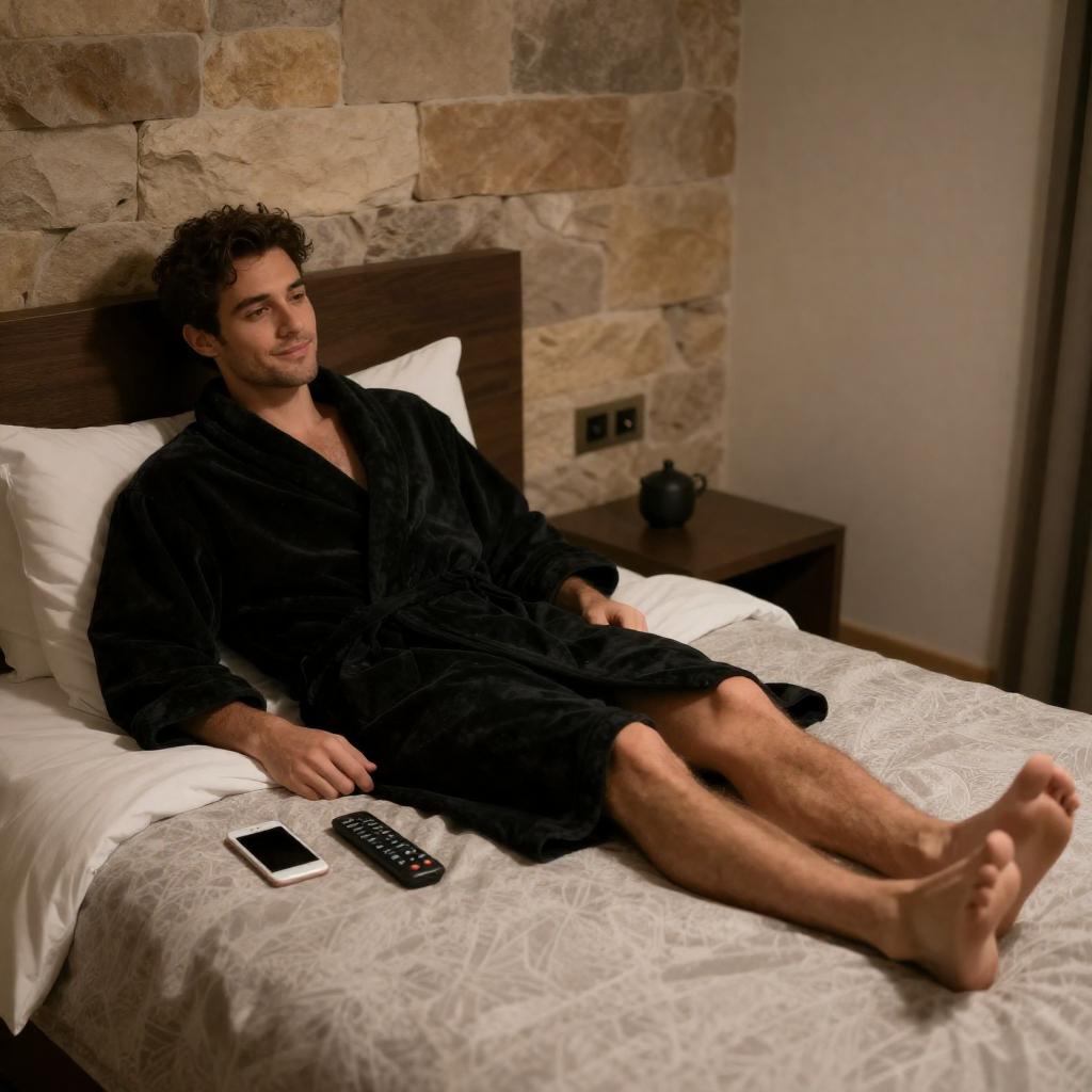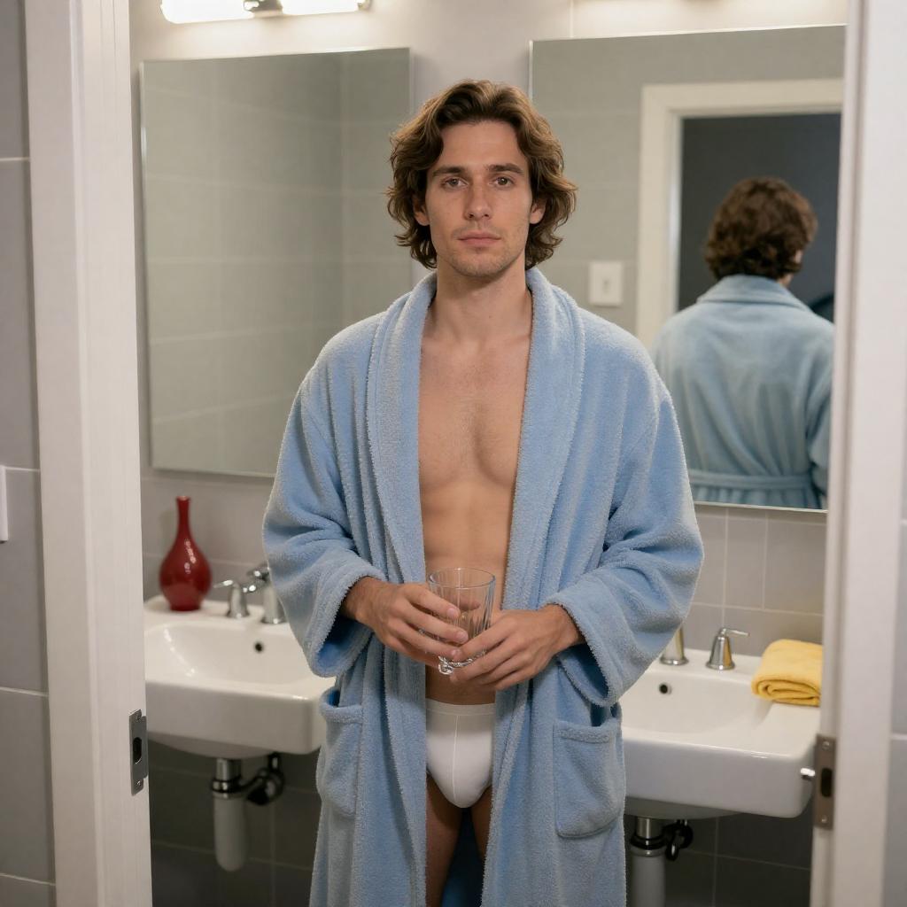 Man with shoulder-length brown hair, wearing a light blue bathrobe and white underwear, stands in a bathroom doorway holding a glass. He has a neutral expression. Bathroom has dual sinks, gray tiled walls, red and blue vases, and yellow towel. Mirror reflects his back.