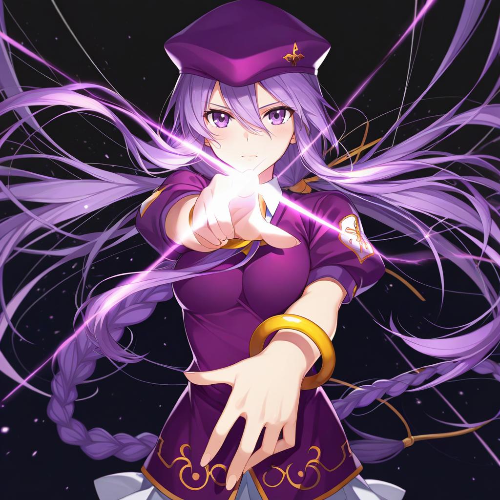 Digital illustration of an anime-style girl with very long purple hair and purple eyes, wearing a purple beret and outfit featuring gold accents. The character has a single braid and a golden bracelet, and she is casting a glowing magical spell with an intense expression. The background is dark, emphasizing the bright magical effects.