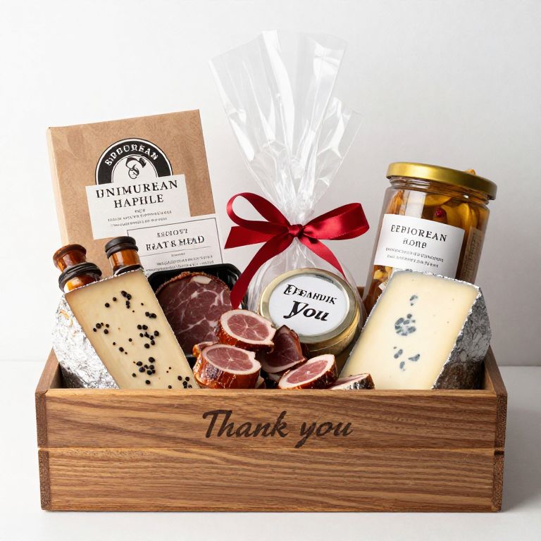 Gourmet gift box with cheese, artisanal jar, ham slices, label, and red ribbon, labeled "Thank you," in wooden crate.