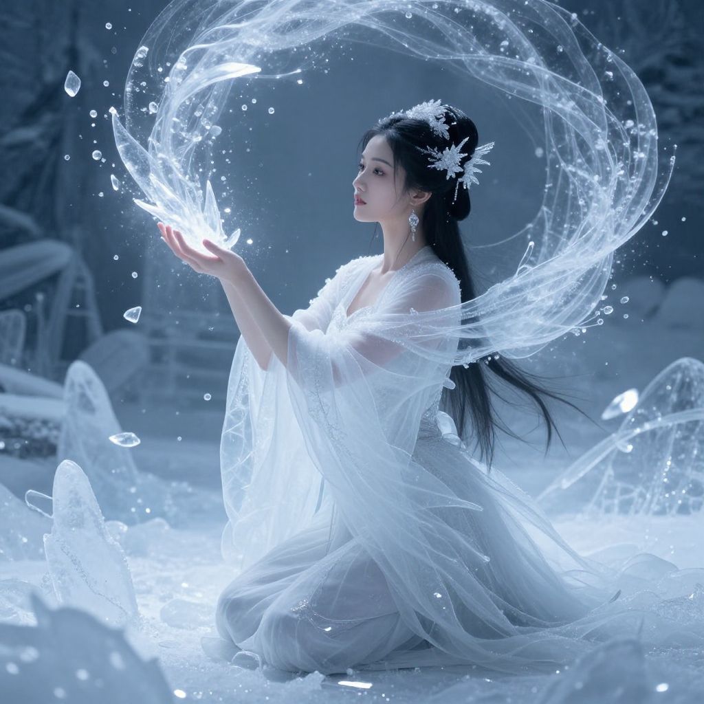 Ethereal woman kneels amidst swirling frost, her hand gently guiding translucent ice shards that float gracefully around her, illuminated by a radiant, icy aura.