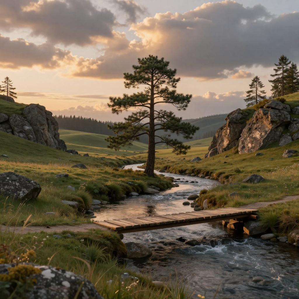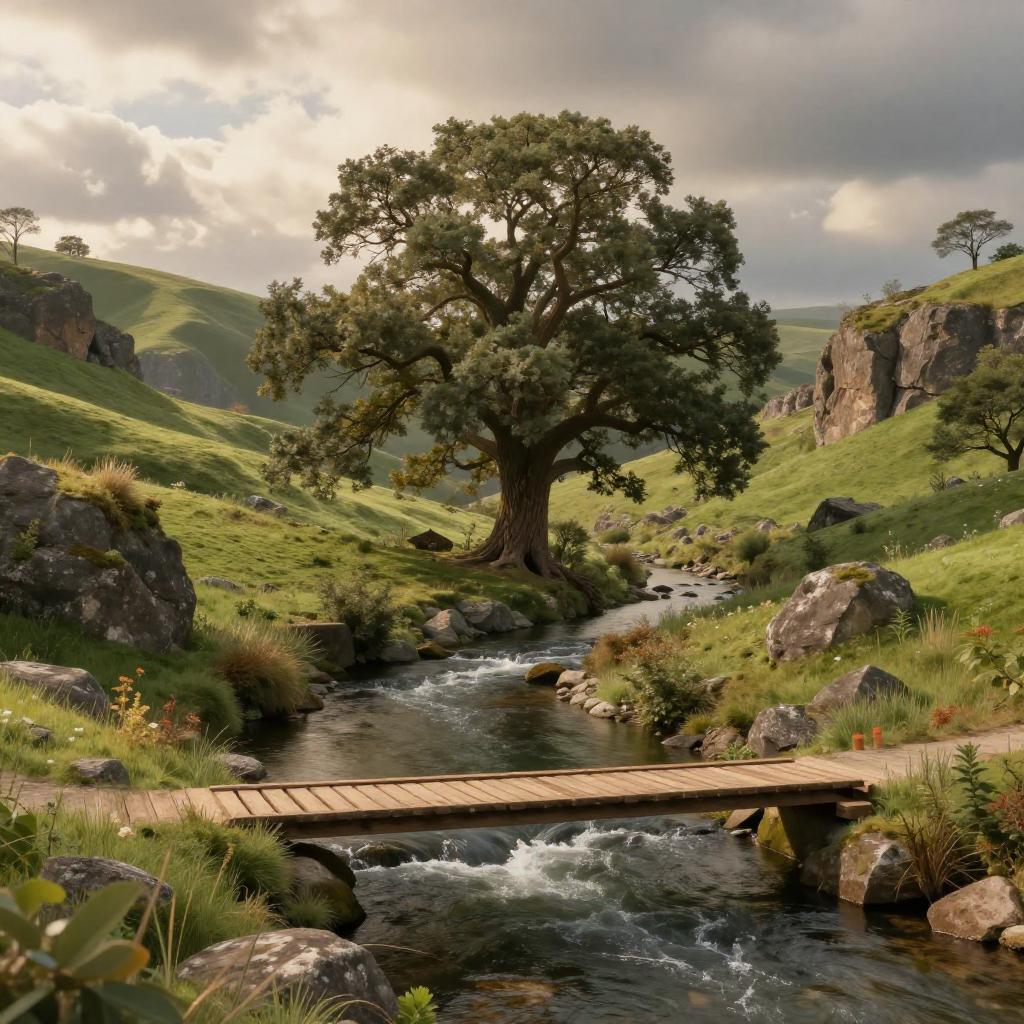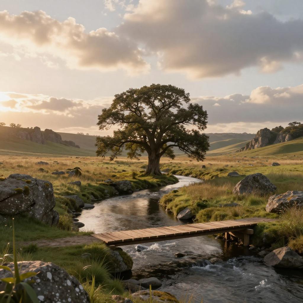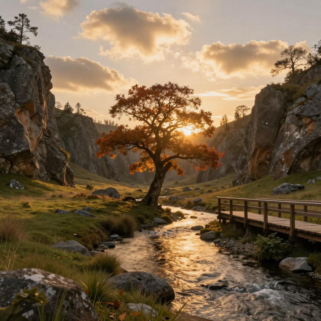 Render Passes Create a serene rocky cliffs landscape featuring a gently winding river, surrounded by lush green hills, with a majestic maple tree standing proudly at the heart of the scene. A morning sunrise illuminates the clouds above, casting a warm, inviting glow on the tranquil setting. A wooden footbridge spans the river, inviting travelers to explore the beauty of the landscape further,