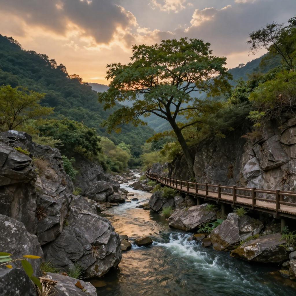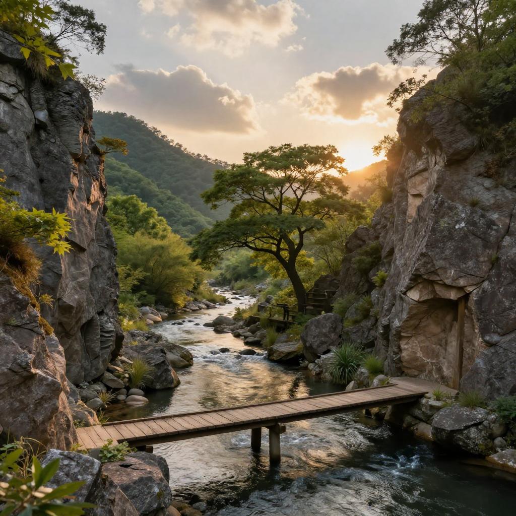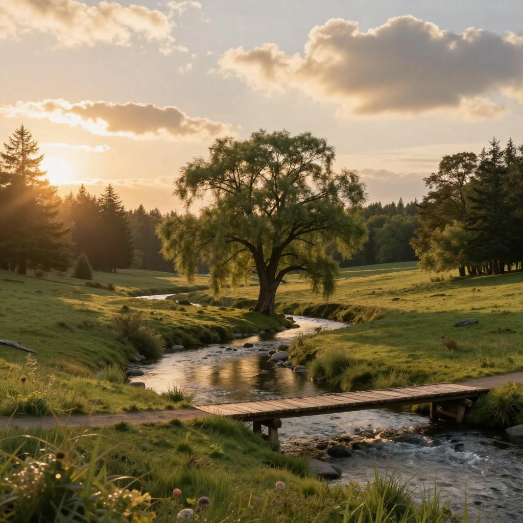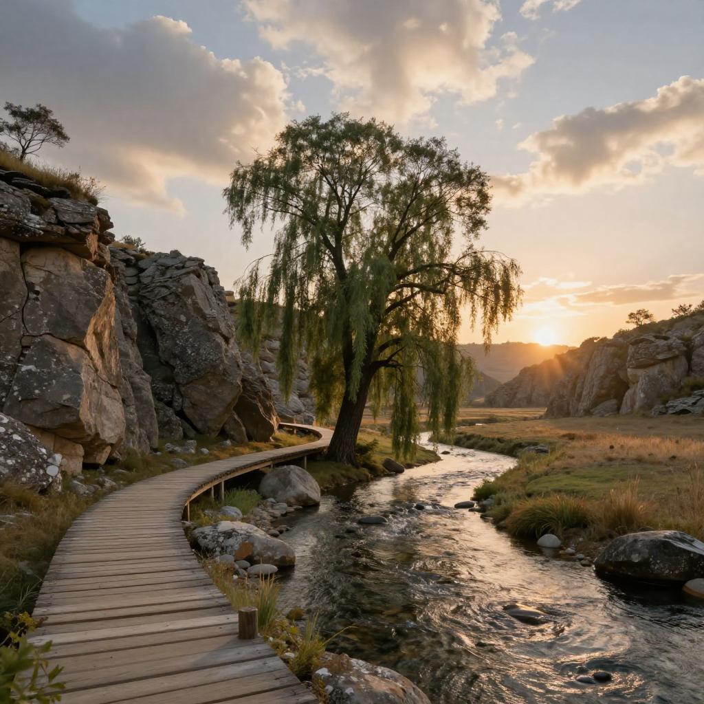 Render Passes Create a serene rocky cliffs landscape featuring a gently winding river, surrounded by lush green hills, with a majestic maple tree standing proudly at the heart of the scene. A morning sunrise illuminates the clouds above, casting a warm, inviting glow on the tranquil setting. A wooden footbridge spans the river, inviting travelers to explore the beauty of the landscape further,