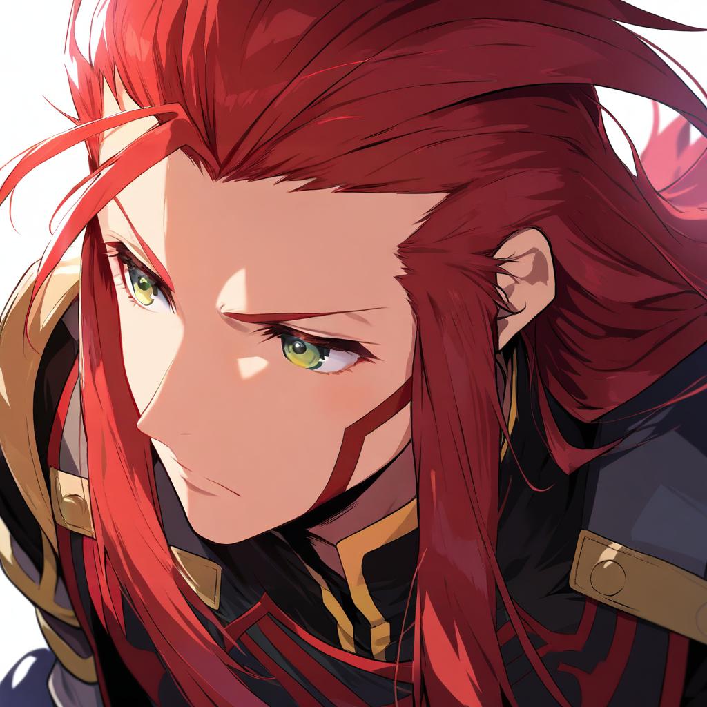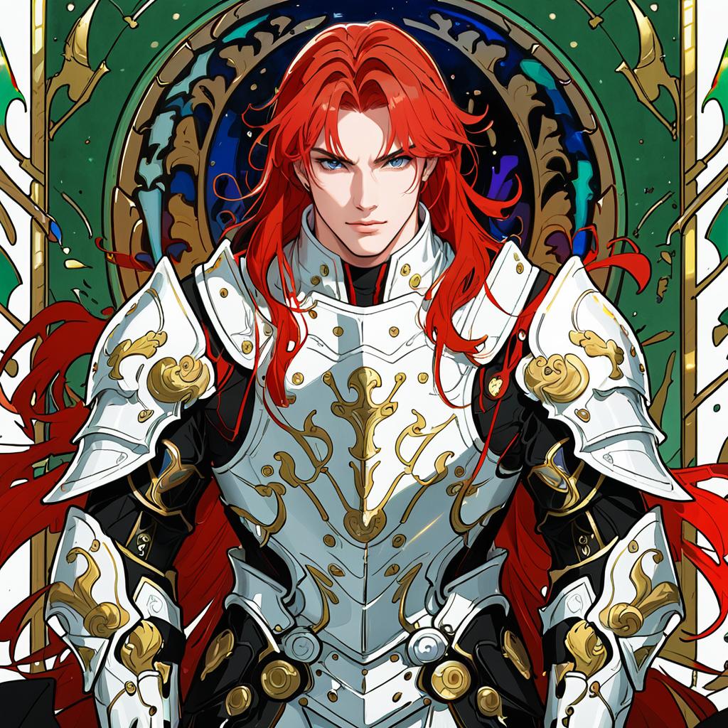 Argenti (honkai: star rail), honkai: star rail, 1boy, green eyes, hair between eyes, red hair, long hair, curtained hair, streaked hair, ahoge, parted bangs, white armor, knight, gauntlets, knight, pauldrons, breastplate, by artist nishihara isao, animagine