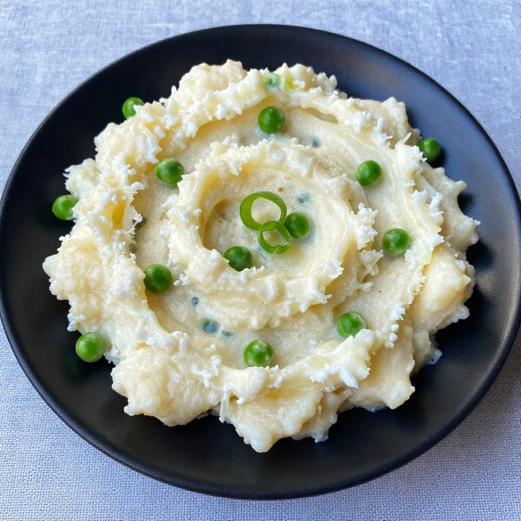 Photograph of creamy mashed potatoes on a black plate, topped with green peas and sliced green onions, against a white textured background.