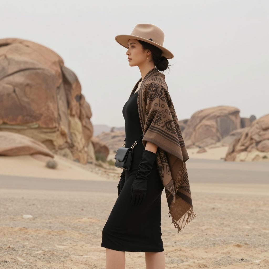 Woman in profile stands in desert landscape with large rock formations. She wears a black dress, black gloves, and a beige hat. Brown patterned shawl over her shoulders, black purse on her hip. Hair in bun. Background: hazy sky, distant rocks. Realistic style.