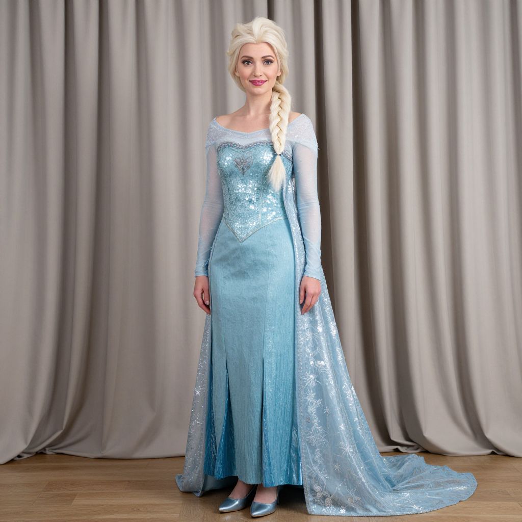 Photograph of a blonde woman in a long, sparkling blue Elsa-style gown with long sleeves, standing against gray curtains, wearing silver shoes, with a