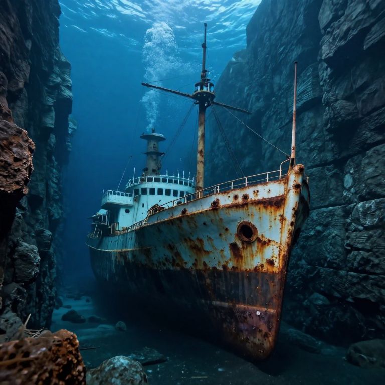 Suspended in the abyssal embrace of ancient stone walls, the sunken ship whispers a haunting symphony of solitude and forgotten dreams, its rusted hull a testament to the inexorable march of time and the enduring mystery of the deep.