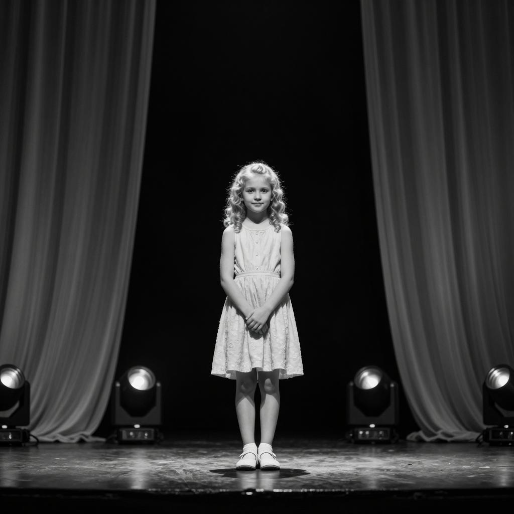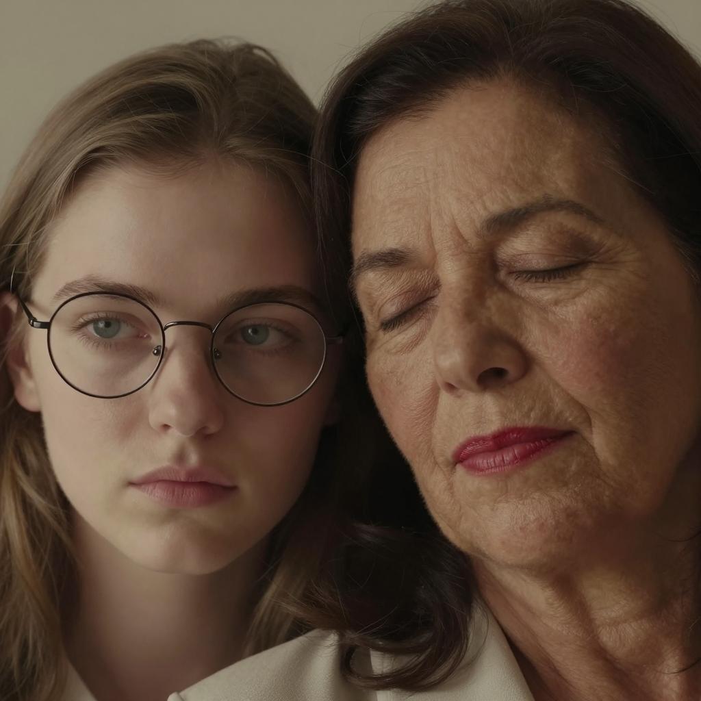 Photograph of a young girl with light brown hair in a ponytail, kissing a bandaged hand against a ured wall. Her eyes are closed, and the bandage has a simple drawing. Dim lighting, shadowed background.