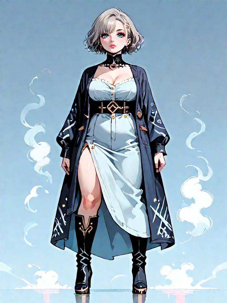 Full body, 1girl, dark_fantasy, nighttime, big boobs, fog, night mist, Chunky heeled thigh-high boots, rich burgundy suede, rounded toe, oversized blazer dress, relaxed fit, light gray houndstooth pattern, single-button closure, notched collar, soft cotton blend, side pockets, modern chic, versatile style.