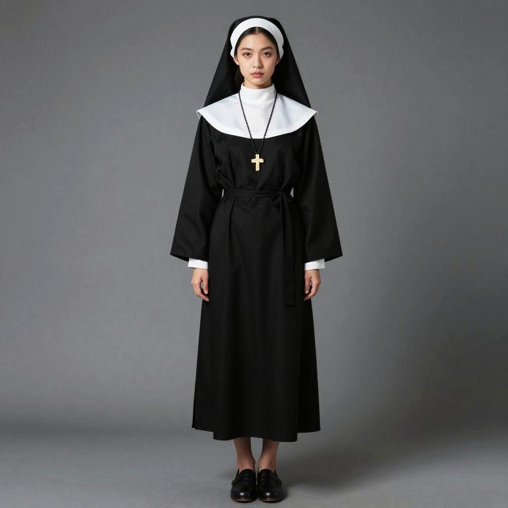 1girl, realistic, solo, (masterpiece:1.2), best quality, nun, necklace, full body, sleeves