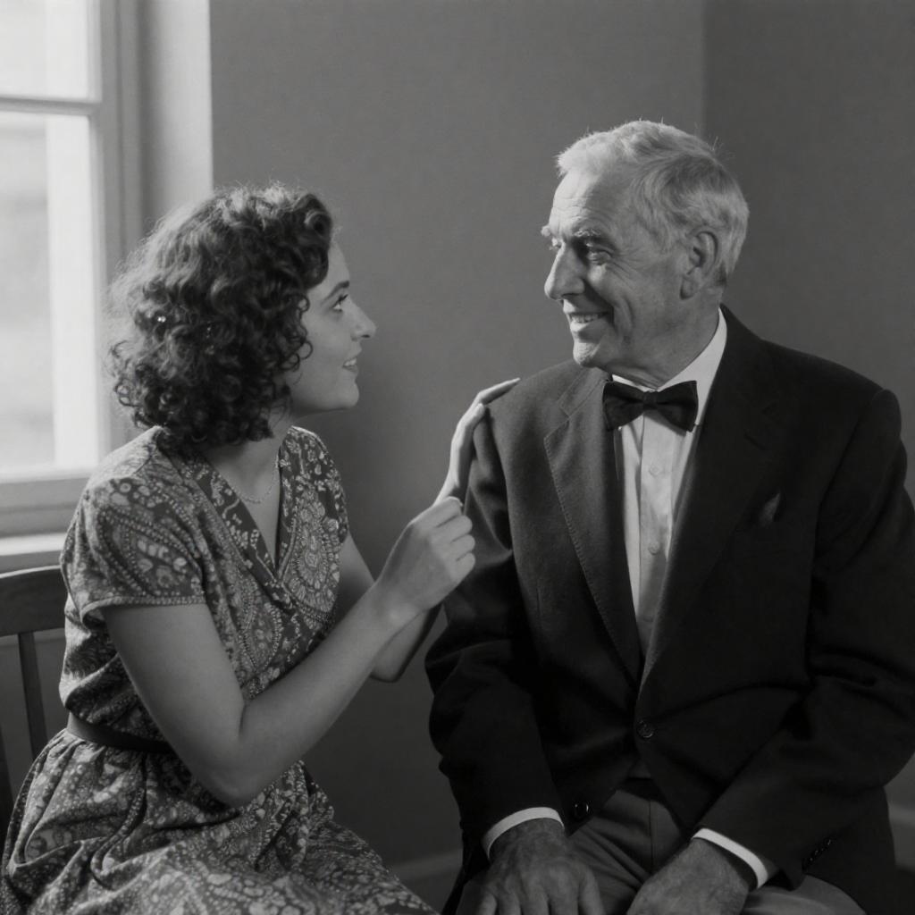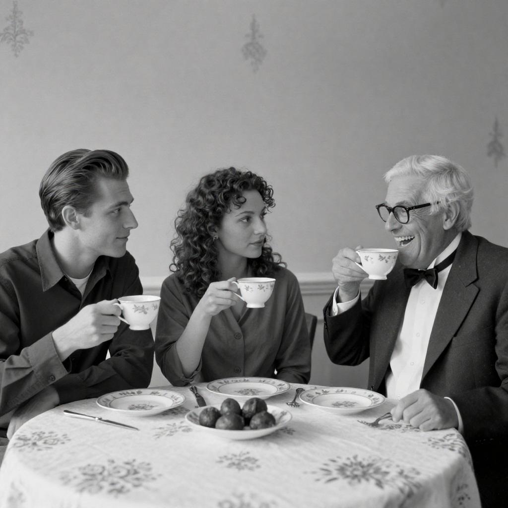 Black and white photograph of three people at a table. Young man with slicked-back hair, medium shot, left, holds teacup. Young woman with curled hair, medium shot, center, holds teacup, looks at older man. Older man with white hair, glasses, bow tie, right, laughs, drinks tea. Plates, teacups, floral tablecloth, patterned wallpaper background.