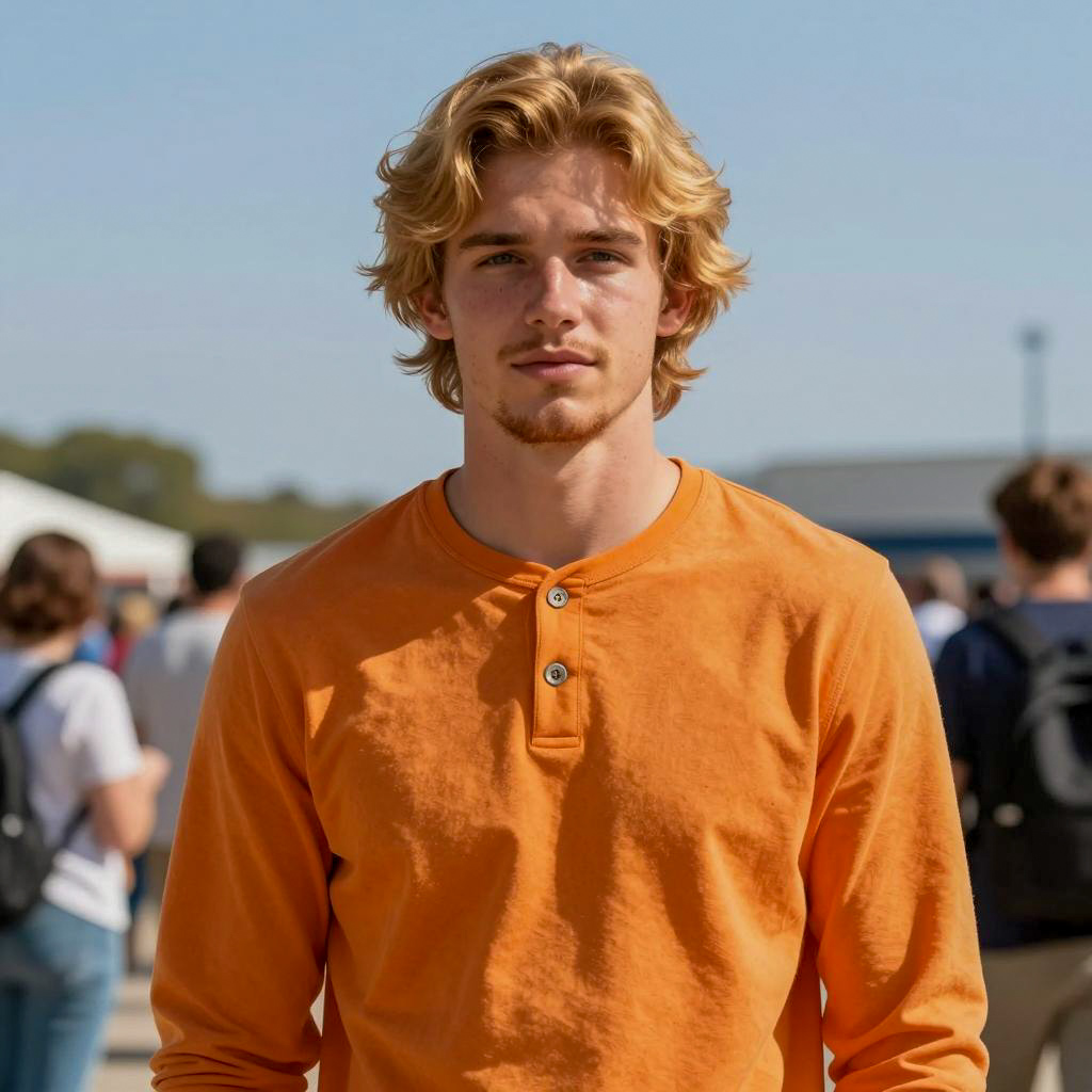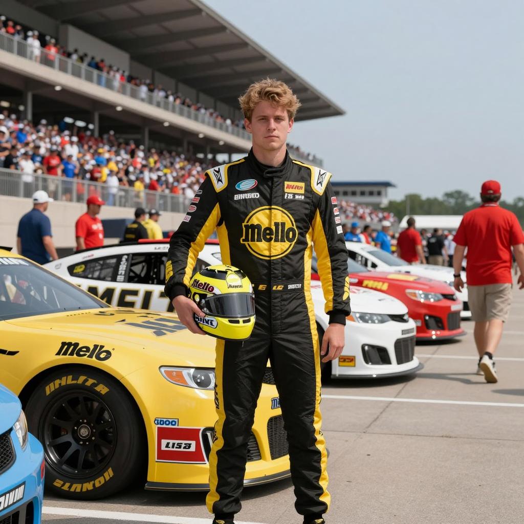 Male NASCAR driver in black and yellow "Mello Yello" racing suit, standing in front of parked race cars. Crowded grandstand with spectators in background. Driver holding helmet, serious expression. Multiple cars lined up in front, some with sponsor s. Bright daylight, clear sky. Several people walking around, some in red shirts.