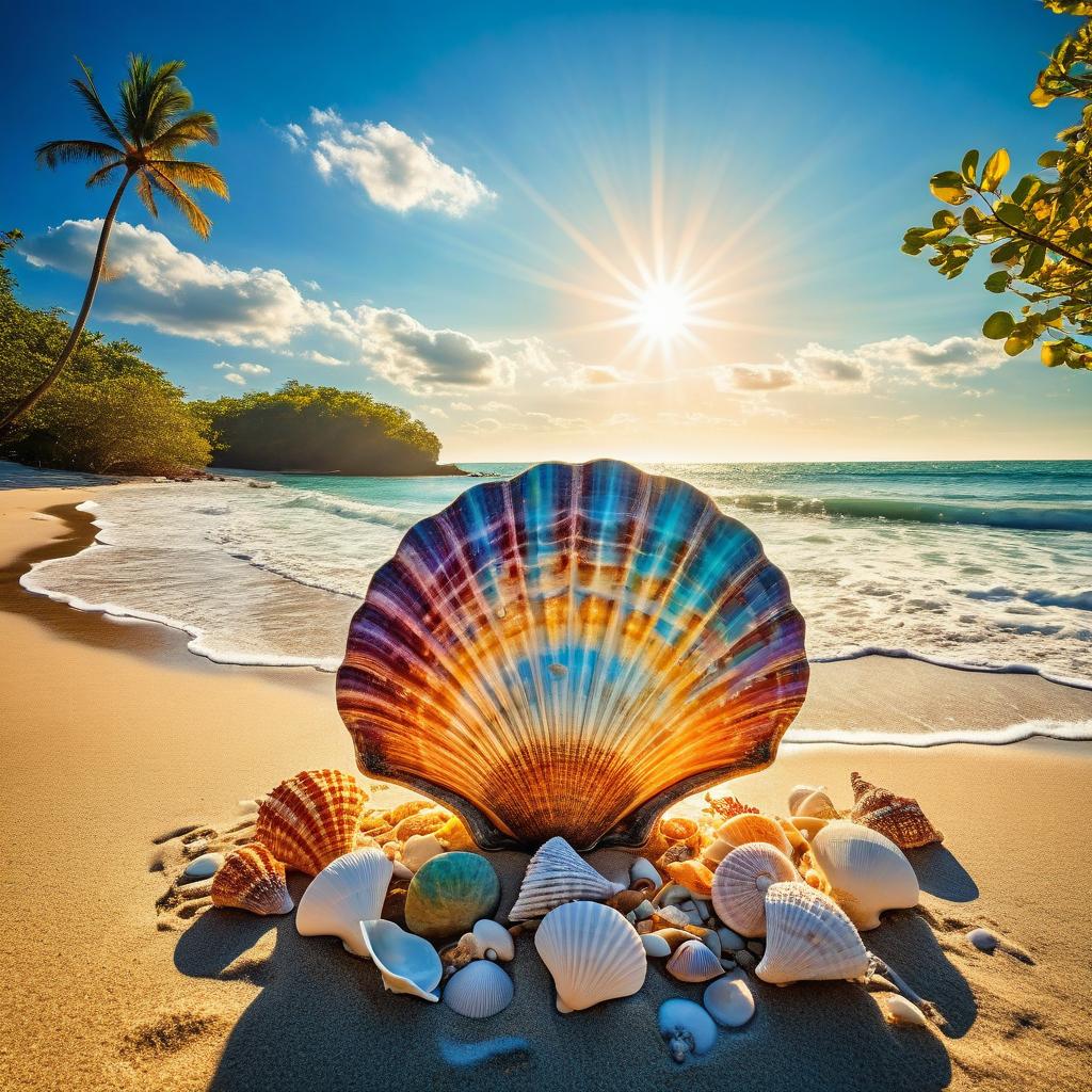 Whimsical high-definition rendering of a serene beach featuring a giant colorful seashell in the foreground. The sun radiates brightly above the seashell, illuminating the tranquil ocean waves and golden sand scattered with smaller seashells and starfish. A lush tree leans over the sandy shore, with distant green hills under a vibrant blue sky dotted with soft clouds.