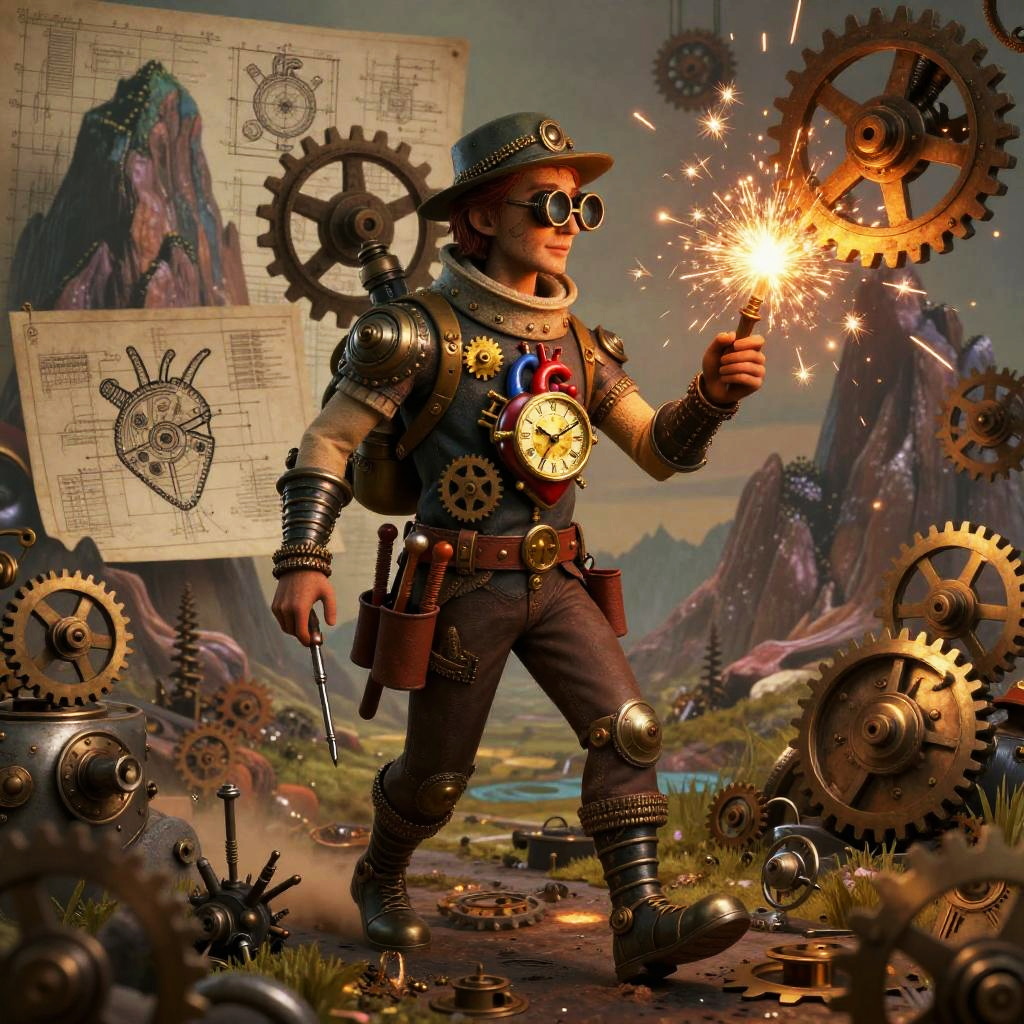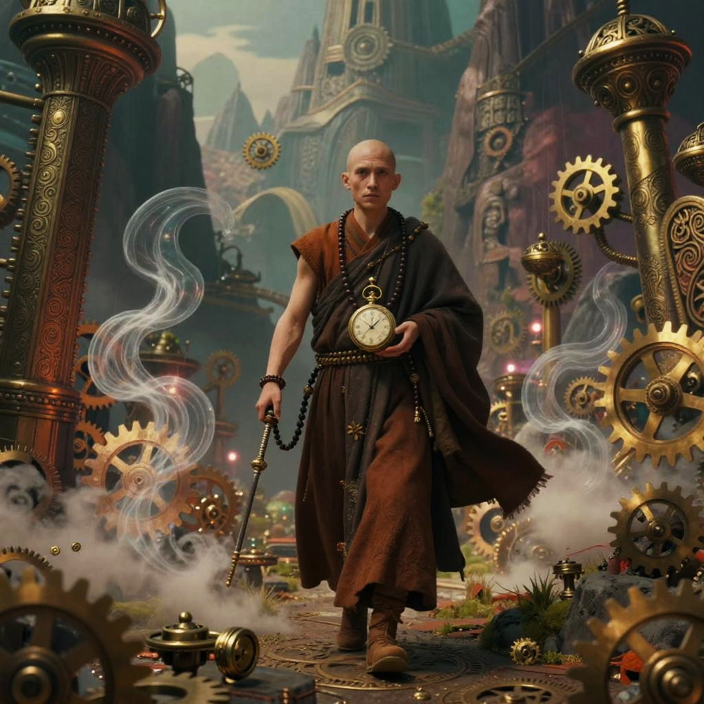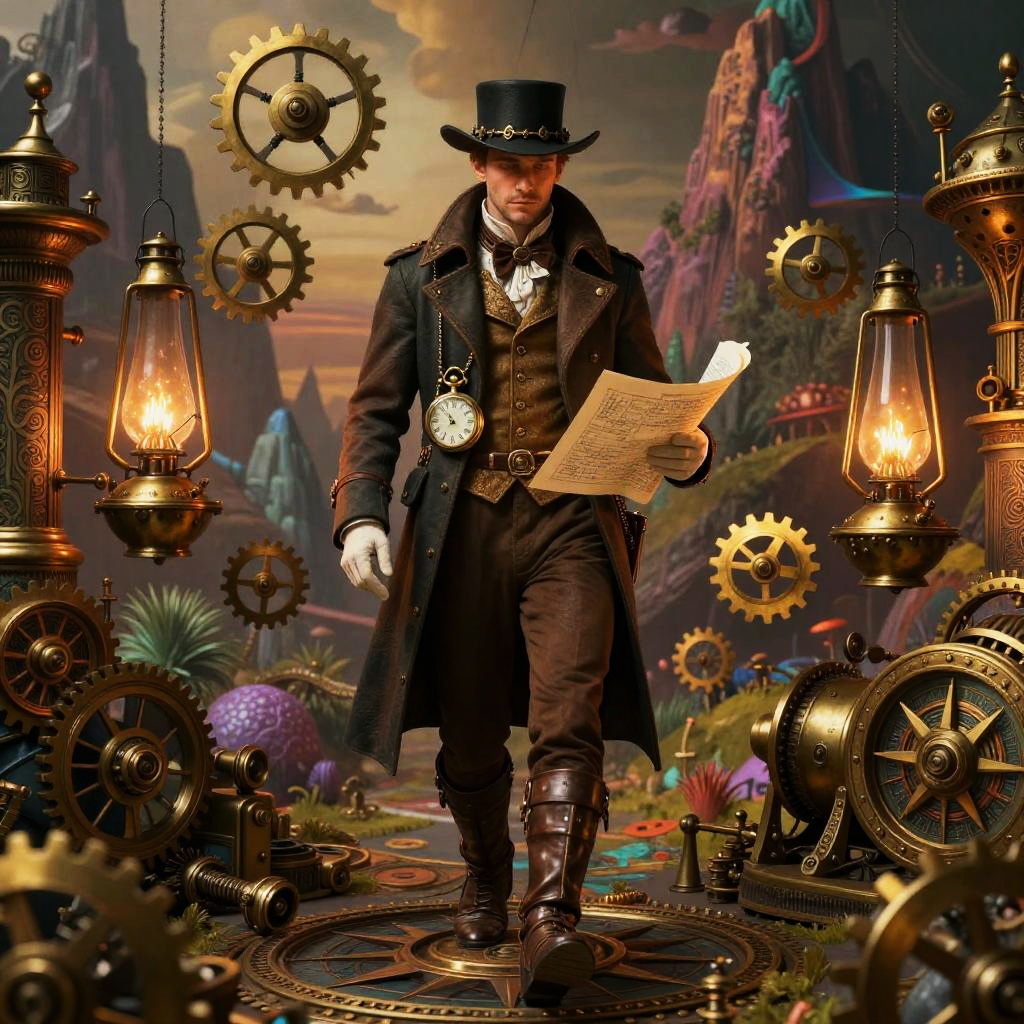 A mystical forest hermit dressed in steampunk attire adorned with carved amulets, walking through an enchanted woodland. The scene features intricate wood grain, vine tendrils intertwined with mechanical cogs, and bioluminescent insects emitting a soft glow. The hermit carries an ornate lantern and a herbal pouch, set against a surreal background of moss-covered rocks and mountainous terrain. The image is rich in earthy tones complemented by vibrant, glowing elements, creating a whimsical and mysterious atmosphere.