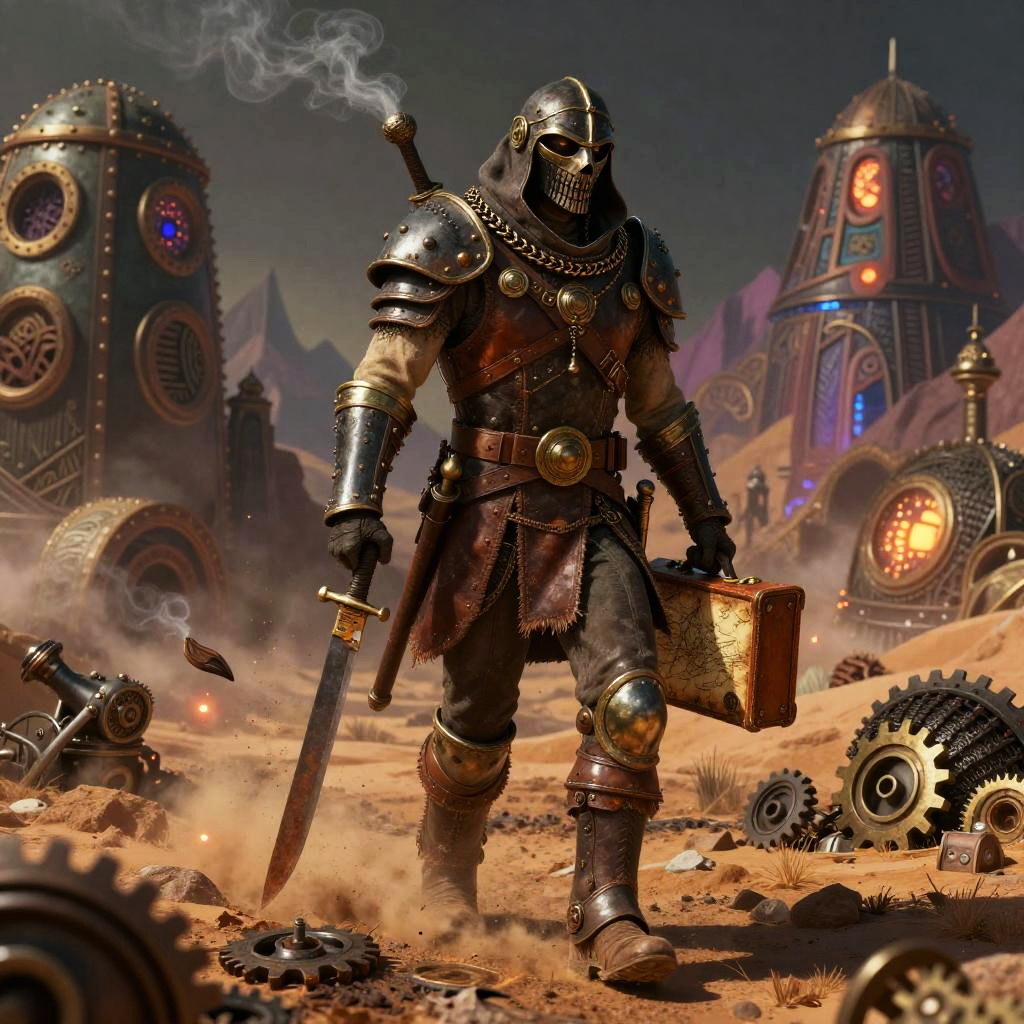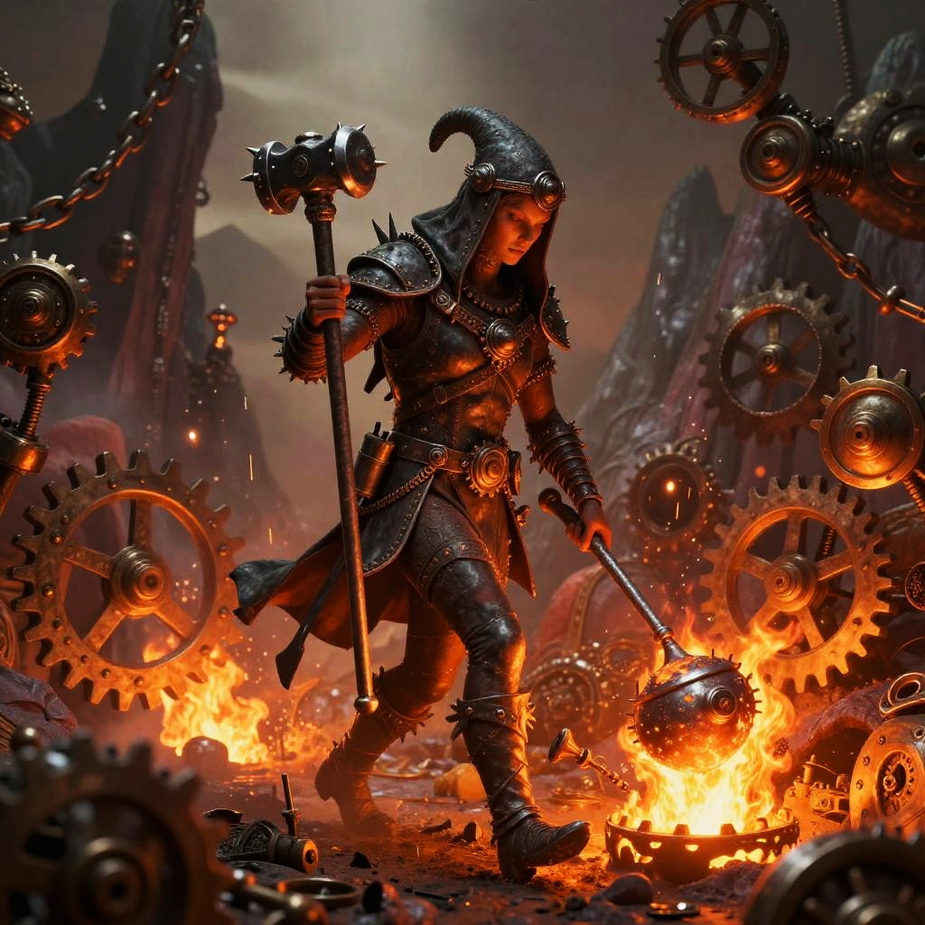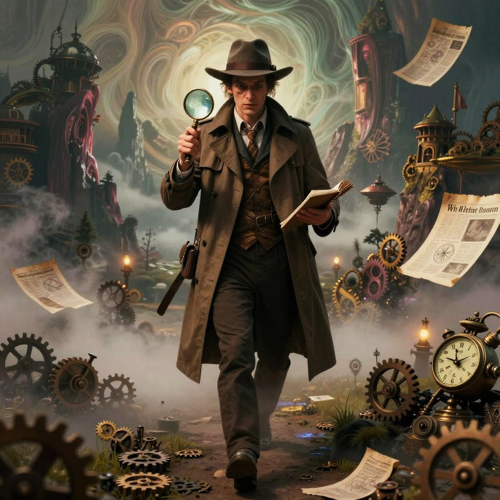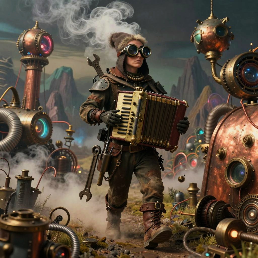 A mystical forest hermit dressed in steampunk attire adorned with carved amulets, walking through an enchanted woodland. The scene features intricate wood grain, vine tendrils intertwined with mechanical cogs, and bioluminescent insects emitting a soft glow. The hermit carries an ornate lantern and a herbal pouch, set against a surreal background of moss-covered rocks and mountainous terrain. The image is rich in earthy tones complemented by vibrant, glowing elements, creating a whimsical and mysterious atmosphere.