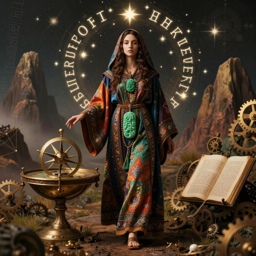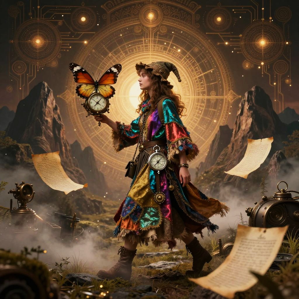 (Steampunk psychedelic artstyle), a enigmatic forest hermit adorned with carved amulets walking with an ornate lantern and herbal pouch, surrounded by bioluminescent insects and drifting spores. Set against a surreal mountainous terrain with intricate wood grain textures, vine tendrils interlaced with cogs, and mossy growths. The scene is illuminated by ambient glowing light, adding atmospheric depth and a whimsical, mysterious vibe. Rendered in rich earthy tones with vibrant, contrasting colors and vintage textures, ultra-detailed in HD quality. Captures the essence of The Hermit, blending mysticism with intricate steampunk details.