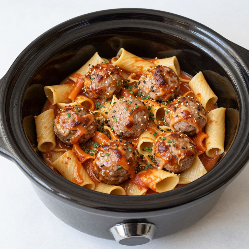 Easy, Homemade Spaghettios and Meatballs made in the slow cooker. This crockpot recipe is delicious enough for kids AND adults!