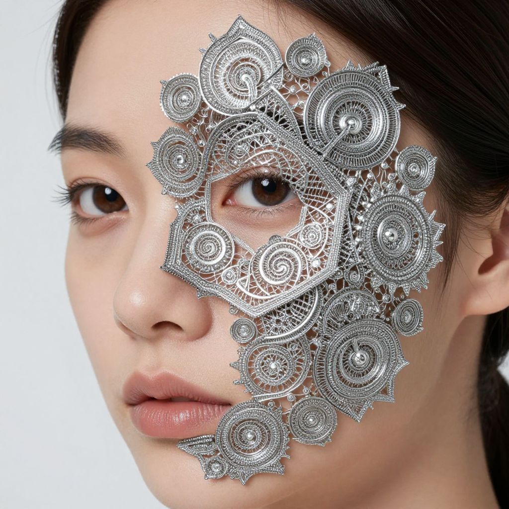 Ridiculously beautiful young woman face photo, skin covered lace jewelry arranged in hexagon fractal mandelbulb 3 d, made of silver, layers of intricate swirling fractals, woven glittering