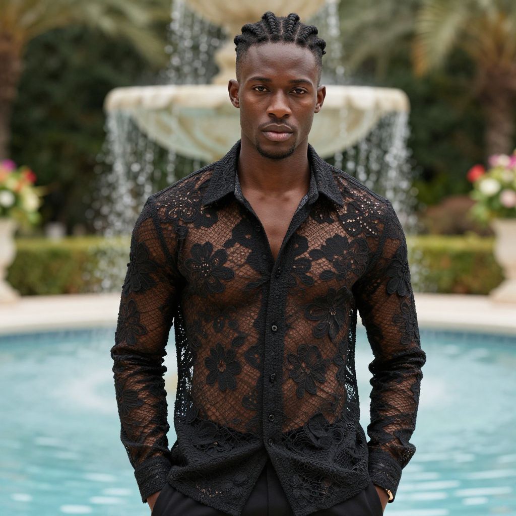 In this captivating image, a beautifully styled black man stands confidently in a luxurious setting, exuding an air of sophistication and elegance. His intricate lace shirt, adorned with elaborate floral patterns, contrasts strikingly with his muscular physique, creating a striking visual effect. The shirt's sheer fabric reveals a hint of his well-defined torso, adding to the allure. His hair is meticulously styled in a modern, braided design, complementing his overall look. The background features a serene pool, with water cascading from a fountain, surrounded by lush greenery and vibrant flowers, enhancing the tranquil ambiance. The composition is masterfully crafted, with the model positioned centrally, drawing the viewer's attention to his striking features and the detailed textures of his attire. The depth of field is expertly managed, with the background softly blurred, ensuring the focus remains on the model. The overall scene is a harmonious blend of modern art and fashion, capturing a moment of timeless beauty.