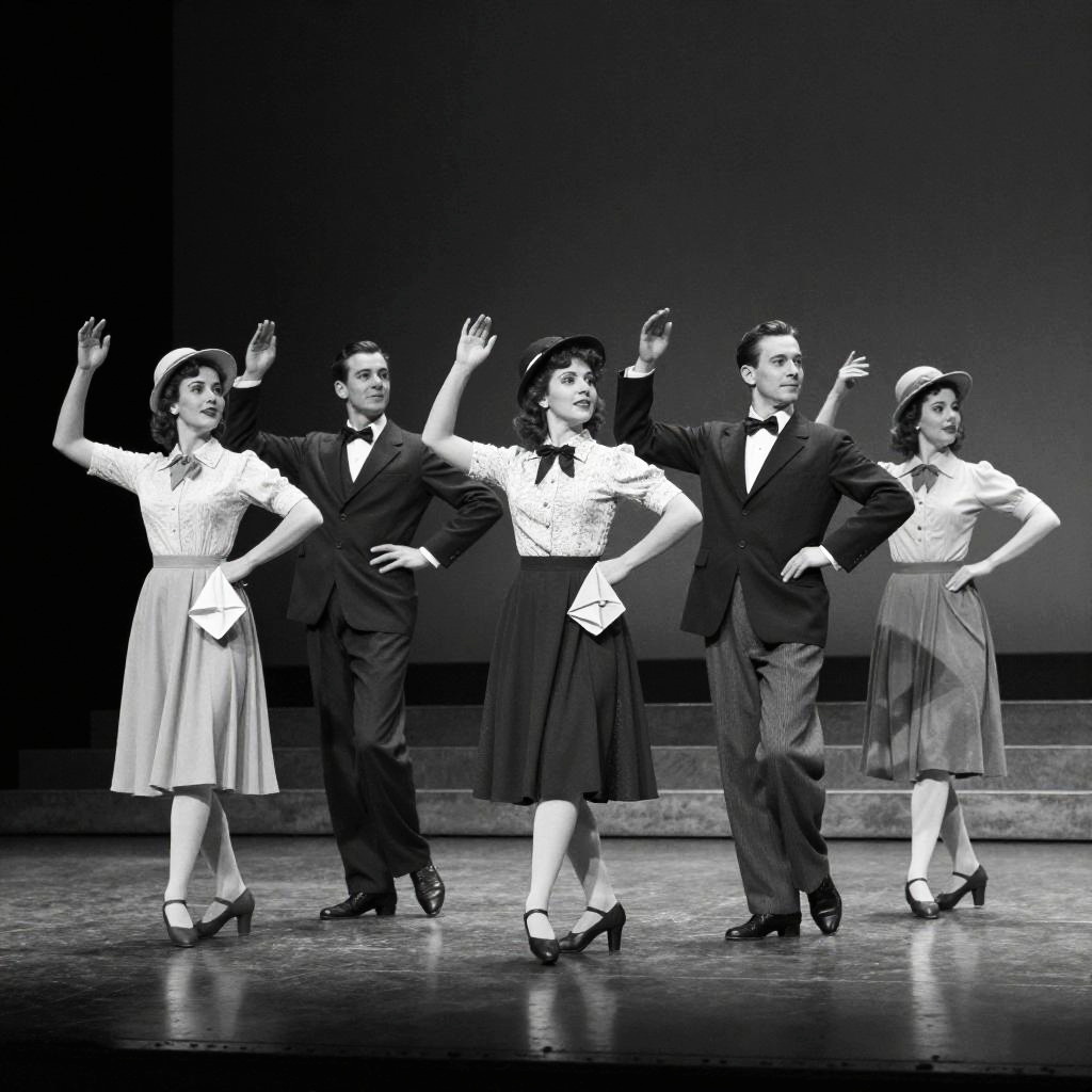 This black-and-white photograph captures a mid-20th-century dance performance on stage. Five dancers, dressed in vintage attire, stand in a line. The men wear dark suits with bow ties, while the women sport knee-length dresses and patterned blouses. One woman holds a handkerchief, and another has a hat. The stage has a reflective floor, with steps in the background. The dancers' poses suggest a lively, choreographed routine.