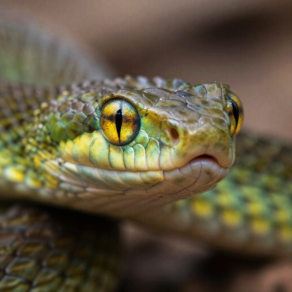 Portrait of a venomous serpent made of lustrous emerald scales with iridescent skin and coiled posture, dramatic lighting.